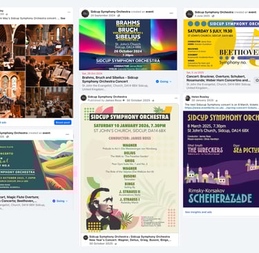 Since 2021, Helen has supported the Sidcup Symphony Orchestra by creating social media content and promotional posters, managing Eventbrite event listings, and photographing concerts.